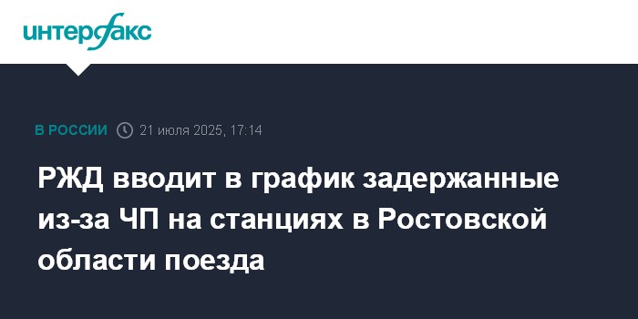 Москва. 21 июля. INTERFAX.RU - Пассажирские поезда, задержанные из-за падения обломков беспилотников на станциях Лихая и Каменоломни в Ростовской области, вводятся в график, сообщает телеграм-канал РЖД.