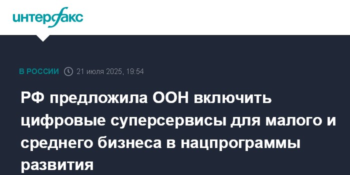 Москва. 21 июля. INTERFAX.RU - Россия успешно применяет цифровые суперсервисы, объединяющие регистрацию бизнеса, банковское дело, соблюдение налогового законодательства, и готова поделиться этими инструментами со странами-членами ООН.
