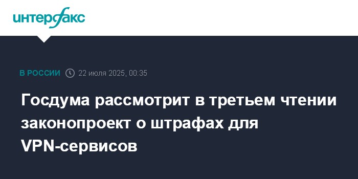 Москва. 22 июля. INTERFAX.RU - Госдума во вторник рассмотрит в третьем, окончательном, чтении законопроект об административной ответственности для владельцев VPN-сервисов за неисполнение требования об ограничении доступа к запрещенным в РФ сайтам и за рекламу таких сервисов.