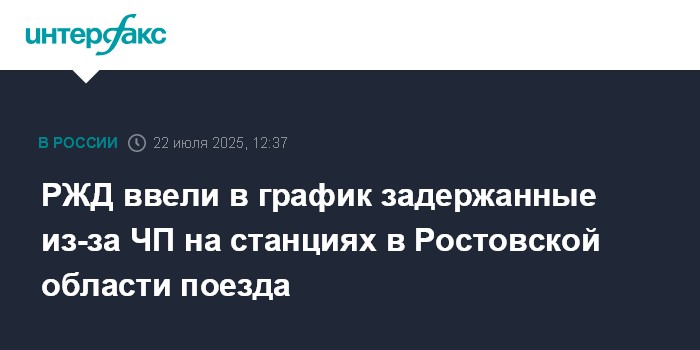 Москва. 22 июля. INTERFAX.RU - Пассажирские поезда, задержанные 20-21 июля из-за падения обломков беспилотников на станциях Лихая и Каменоломни в Ростовской области, введены в график, сообщает телеграм-канал РЖД.