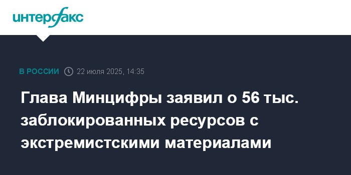 Москва. 22 июля. INTERFAX.RU - Роскомнадзор заблокировал доступ к 56 тыс. ресурсов с экстремистскими материалами, которые внесены в соответствующий реестр Минюста РФ; в адрес зарубежных платформ направлено 20 тыс. запросов об удалении, которые не исполняются, сообщил министр цифрового развития, связи и массовых коммуникаций Максут Шадаев.