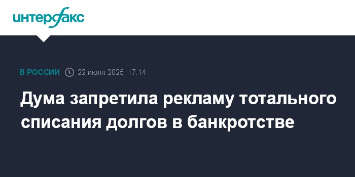 Москва. 22 июля. INTERFAX.RU - Госдума приняла в третьем чтении закон, который вводит ограничения на рекламу услуг по банкротству граждан. Нельзя будет обещать полное освобождение от долгов, призывать не платить долги.