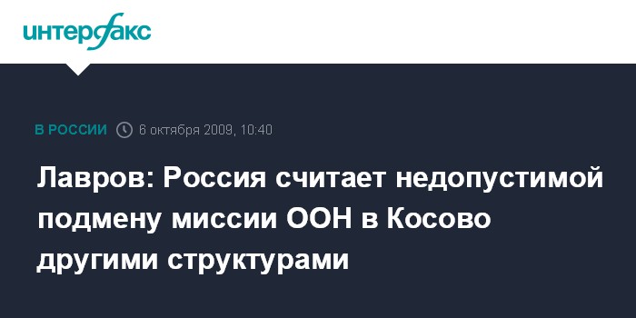 Москва. 6 октября. INTERFAX.RU – Глава МИД РФ Сергей Лавров призывает не допускать подмены миссии ООН в Косово другими структурами.