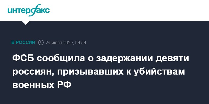 Москва. 24 июля. INTERFAX.RU - ФСБ РФ сообщила о задержании и аресте жителей Краснодарского края, Астраханской, Владимирской, Мурманской, Омской, Херсонской, Ярославской областей, Еврейской автономной области, которые публиковали в сети призывы к убийству российских военных.