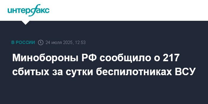 Москва. 24 июля. INTERFAX.RU - Российские военные за сутки сбили 217 украинских дронов, а также ракету "Нептун", сообщили в Минобороны РФ в четверг.