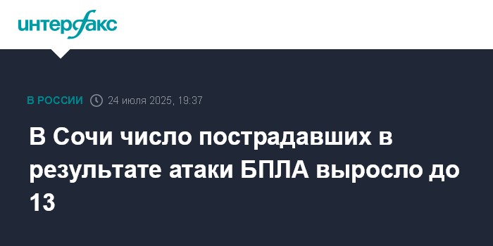 "Число пострадавших в результате атаки БПЛА в Сочи увеличилось до 13 человек. В течение дня 24 июля в больницы курорта обратились еще два человека. Им оказали амбулаторную помощь. Таким образом, в результате атаки (...) погибли два человека, ещё 13 пострадали", - говорится в сообщении.