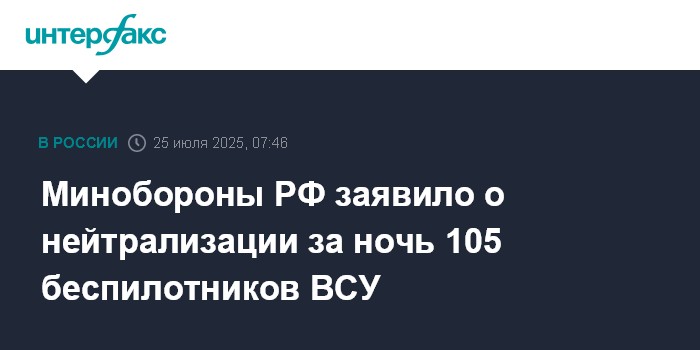 Москва. 25 июля. INTERFAX.RU - Минобороны РФ сообщило, что в ночь на пятницу средствами ПВО перехвачено и уничтожено 105 украинских беспилотников.