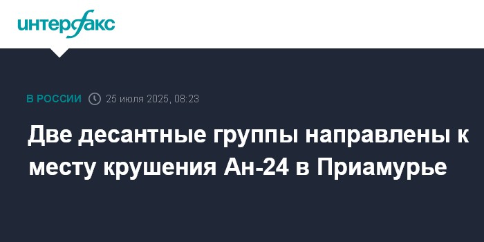 Москва. 25 июля. INTERFAX.RU - Десантники "Амурской авиабазы" вылетели к месту крушения самолета Ан-24 в Приамурье для создания посадочной площадки, сообщает Амурский центр гражданской защиты и пожарной безопасности.