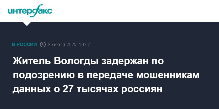 Москва. 25 июля. INTERFAX.RU - В Череповце задержан житель Вологды, подозреваемый в передаче персональных данных телефонным мошенникам, сообщила представитель МВД Ирина Волк.