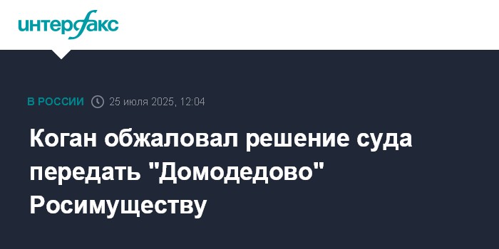 Москва. 25 июля. INTERFAX.RU - Бывший председатель набсовета "Домодедово" Валерий Коган подал апелляционную жалобу на решение Арбитражного суда Московской области, вследствие которого активы аэропорта были переданы Росимуществу.