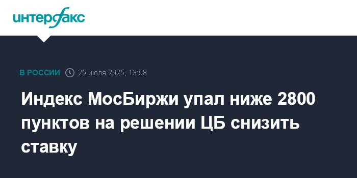 Индекс МосБиржи упал ниже 2800 пунктов на решении ЦБ снизить ставку