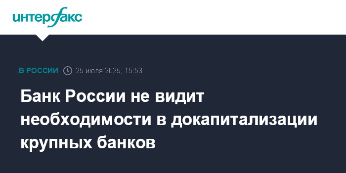 Москва. 25 июля. INTERFAX.RU - Банк России не видит сейчас необходимости в докапитализации крупных банков из-за "навеса" плохих долгов, стоимость риска по корпоративным кредитам далека от рекордов, по розничным кредитам отчисления ожидаемо выше нормы, но это не критично, заявила на пресс-конференции глава ЦБ Эльвира Набиуллина.