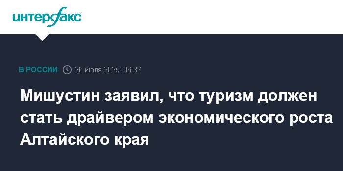 Москва. 26 июля. INTERFAX.RU - Премьер-министр РФ Михаил Мишустин заявил, что туризм должен стать одним из важнейших драйверов экономического роста Алтайского края, реконструкция автодороги Р-256 "Чуйский тракт" позволит раскрыть этот потенциал.