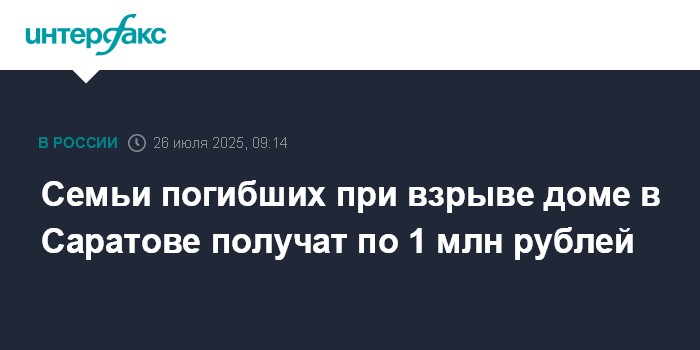 Москва. 26 июля. INTERFAX.RU - Власти Саратовской области приняли решение выплатить семьям погибших при взрыве газа в жилом доме в Саратове материальную помощь по 1 млн рублей, сообщал губернатор Роман Бусаргин в своем телеграм-канале.