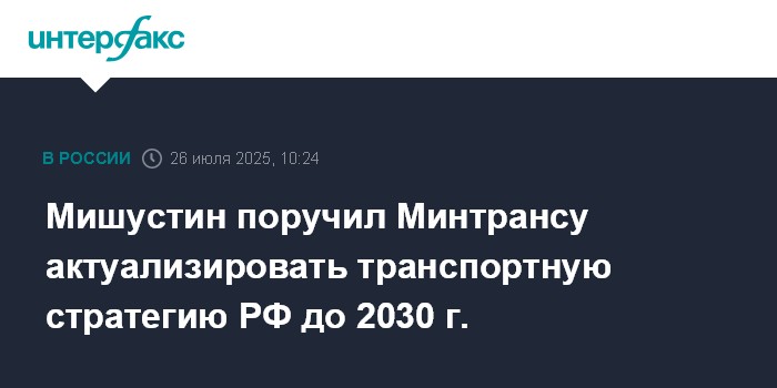 Москва. 26 июля. INTERFAX.RU - Премьер-министр РФ Михаил Мишустин дал поручение Минтрансу актуализировать транспортную стратегию России до 2030 года с прогнозом на период до 2035 года.
