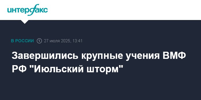 Москва. 27 июля. INTERFAX.RU - Военно-морской флот России завершил крупные маневры "Июльский шторм", в которых задействовали более 150 кораблей и 15 тыс. военнослужащих, сообщило Минобороны РФ в воскресенье.