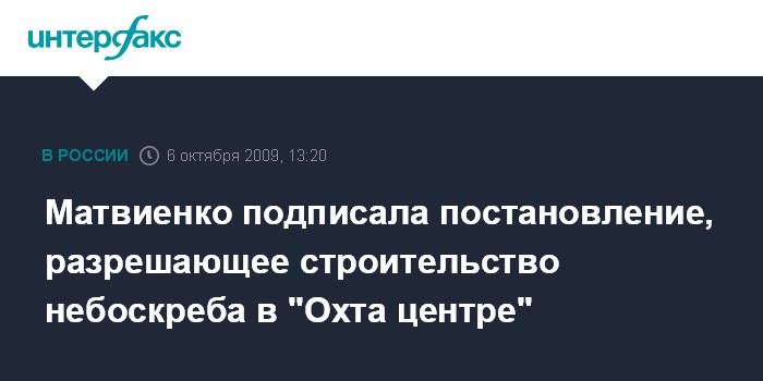 Санкт-Петербург. 6 октября. INTERFAX.RU - Губернатор Петербурга Валентина Матвиенко подписала постановление о предоставлении разрешения на отклонение от предельных параметров при строительстве высотной доминанты общественно-делового района "Охта центр".