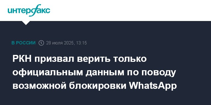 Москва. 28 июля. INTERFAX.RU - Роскомнадзор (РКН) в связи с появившейся в СМИ и соцсетях информацией о возможной блокировке мессенджера WhatsApp в РФ с 1 августа призвал доверять только официальным данным.