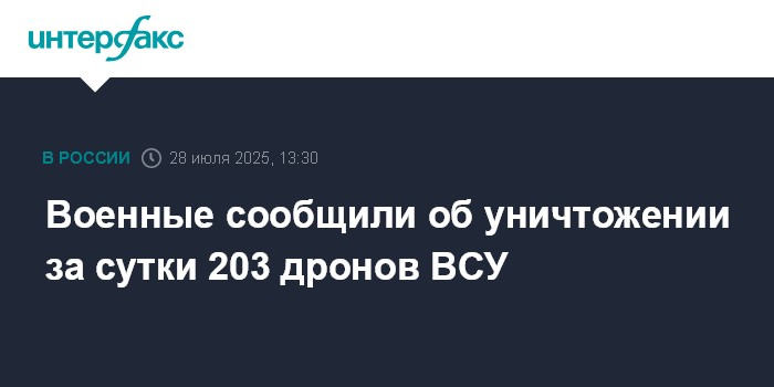 Москва. 28 июля. INTERFAX.RU - Минобороны РФ заявило, что 203 украинских беспилотника и реактивный снаряд системы залпового огня HIMARS сбиты за сутки российскими военными.