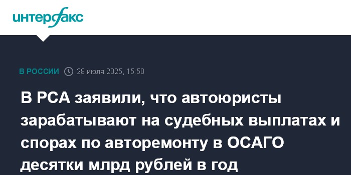 Москва. 28 июля. INTERFAX.RU - Автоюристы, использующие сложившиеся противоречия реальной ситуации в сфере авторемонта и ряда положений закона об ОСАГО о выплатах в натуральной форме (в виде авторемонта), задействуют суды и зарабатывают на судебных выплатах десятки миллиардов рублей в год, такую оценку привел в интервью "Интерфаксу" президент Российского союза автостраховщиков (РСА) Евгений Уфимцев.