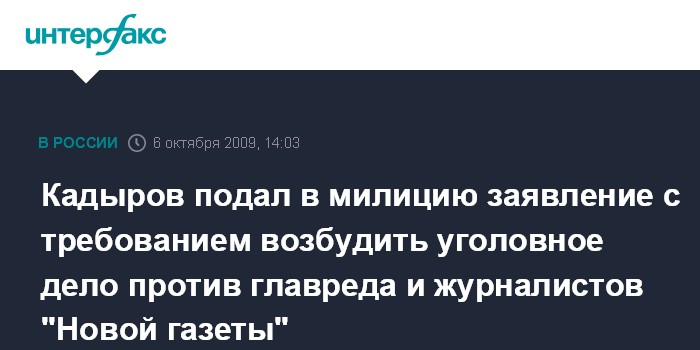 Москва. 6 октября. INTERFAX.RU - Президент Чечни Рамзан Кадыров просит возбудить уголовное дело о клевете в отношении главного редактора "Новой газеты" Дмитрия Муратова и нескольких журналистов издания, сообщил адвокат главы республики Андрей Красненков.