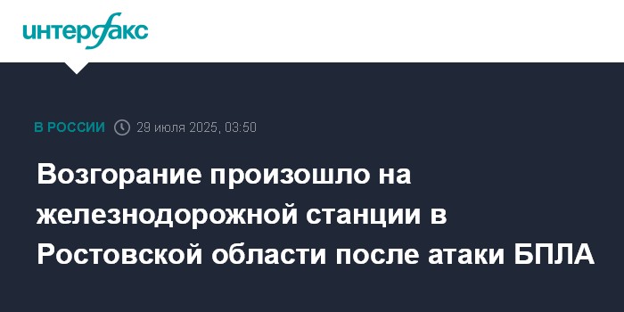 Москва. 29 июля. INTERFAX.RU - Врио губернатора Ростовской области Юрий Слюсарь сообщил об отражении атаки БПЛА в регионе, произошло возгорание на железнодорожной станции, пассажирский поезд отведен на безопасное расстояние.