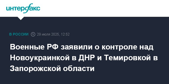 Москва. 29 июля. INTERFAX.RU - Российские военные установили контроль над селами Новоукраинка в ДНР и Темировка в Запорожской области, заявили в Минобороны РФ во вторник.