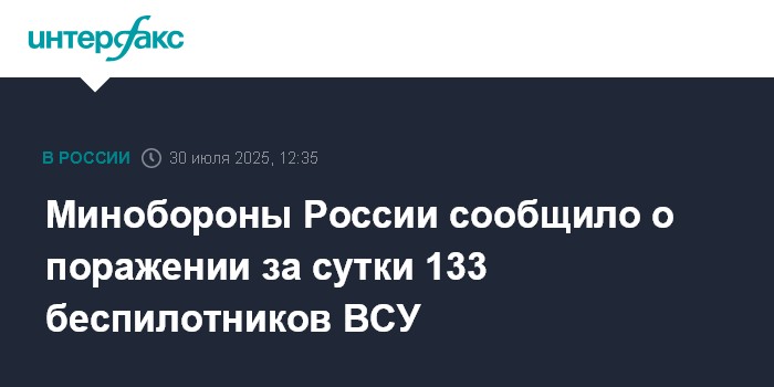 Москва. 30 июля. INTERFAX.RU - Российские средства противовоздушной обороны за сутки нейтрализовали 135 различных целей, сообщили в Минобороны.