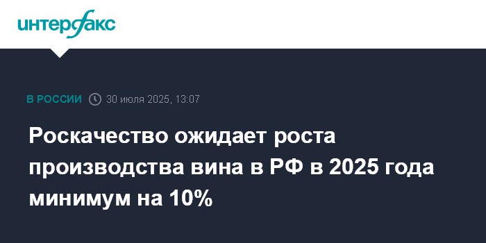 Москва. 30 июля. INTERFAX.RU - Рост производства виноградного вина в России по итогам 2025 года прогнозируется на уровне не менее 10% по сравнению с показателем 2024 года, сообщила "Интерфаксу" заместитель руководителя Роскачества Елена Саратцева.