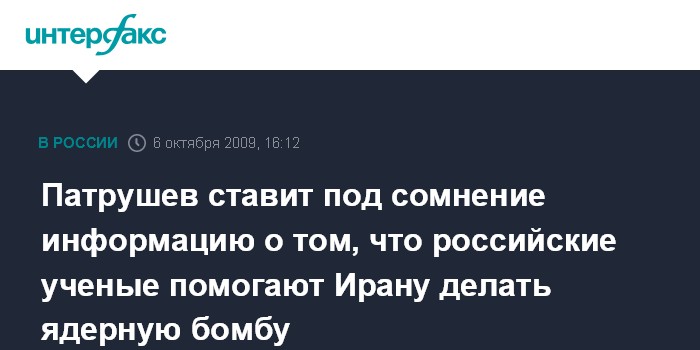 Комментируя во вторник журналистам в Челябинске появившиеся ранее на этой неделе в британской прессе сведения о том, что премьер-министр Израиля Биньямин Нетаньяху в сентябре якобы передал Кремлю список российских ученых, которые, как полагают израильтяне, помогают Ирану в разработке ядерных боезарядов, Н.Патрушев заявил: "Я не знаю, кто им (газетам - ИФ) эту информацию подсунул. Для меня это остается вопросом".