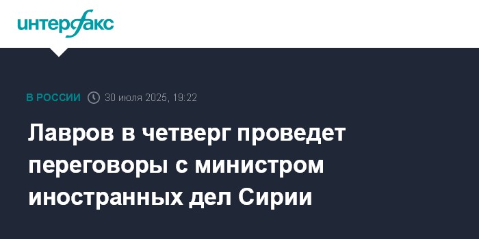 Москва. 30 июля. INTERFAX.RU - Глава МИД РФ Сергей Лавров в четверг проведет переговоры с министром иностранных дел Сирии Асаадом аш-Шибани, сообщила официальный представитель МИД РФ Мария Захарова.