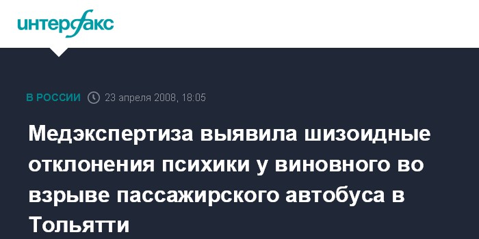 Самара. 23 апреля. INTERFAX.RU - Посмертная психолого-психиатрическая экспертиза Евгения Вахрушева, являющегося единственным фигурантом дела о взрыве пассажирского автобуса в Тольятти, выявила шизоидные отклонения в его психике.