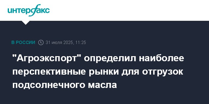 Москва. 31 июля. INTERFAX.RU - Федеральный центр "Агроэкспорт" определил наиболее перспективные рынки для отгрузок бутилированного подсолнечного масла из РФ, а также российские регионы с наибольшим экспортным потенциалом.