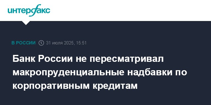 Москва. 31 июля. INTERFAX.RU - Макропруденциальные надбавки по корпоративным кредитам на прирост требований к крупным компаниям с высокой долговой нагрузкой, а также по валютным требованиям не пересматривались, говорится в пресс-релизе Банка России о ряде решений в макропруденциальной политике.