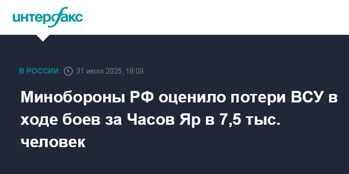 Москва. 31 июля. INTERFAX.RU - Вооруженные силы Украины в ходе боевых действий в районе города Часов Яр в Донецкой Народной Республике потеряли около 7,5 тыс. военнослужащих, сообщили в Минобороны РФ.
