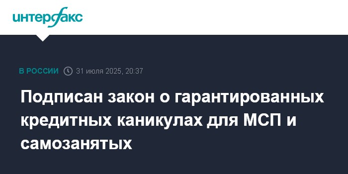 Москва. 31 июля. INTERFAX.RU - Президент РФ Владимир Путин подписал закон, позволяющий субъектам малого и среднего предпринимательства (МСП), а также самозанятым требовать от банков предоставления кредитных каникул сроком до шести месяцев раз в пять лет, независимо от их финансового положения, документ размещен на официальном портале правовой информации.