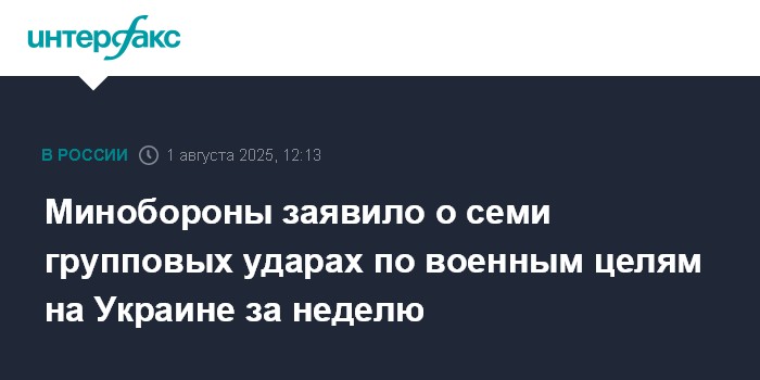 "С 26 июля по 1 августа Вооруженными силами Российской Федерации нанесено семь групповых ударов высокоточным оружием и ударными беспилотными летательными аппаратами, в ходе которых поражены предприятия военно-промышленного комплекса Украины, инфраструктура военных аэродромов, цеха производства беспилотных летательных аппаратов и комплектующих к ним, пункты управления беспилотными летательными аппаратами дальнего действия, склады робототехнических комплексов, ракетного вооружения и боеприпасов", - сообщили в Минобороны РФ в пятницу.