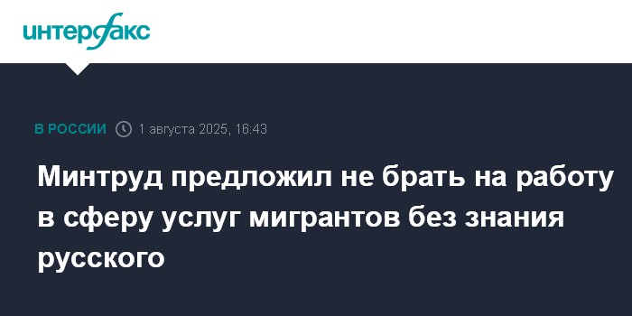 Москва. 1 августа. INTERFAX.RU - Минтруд России предлагает ограничить трудоустройство иностранных граждан из "визовых" стран, не владеющих русским языком, по профессиям, предполагающим социальное взаимодействие и коммуникацию с гражданами РФ.