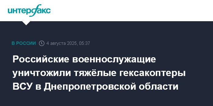 Москва. 4 августа. INTERFAX.RU - Операторы БПЛА группировки "Восток" уничтожили тяжёлые гексакоптеры вооружённых сил Украины и разведывательный беспилотник противника в районе населённого пункта Январское Днепропетровской области, сообщает министерство обороны РФ.