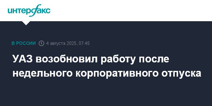 Москва. 4 августа. INTERFAX.RU - Ульяновский автомобильный завод (УАЗ, основной актив "Соллерс") возобновил производство автомобилей после планового корпоративного отпуска, длившегося с 28 июля по 3 августа, сообщили "Интерфаксу" в пресс-службе предприятия.