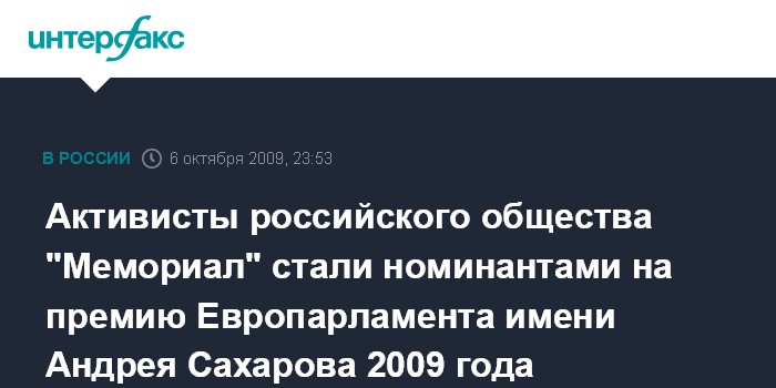 Брюссель. 6 октября. ИНТЕРФАКС - Активисты общества "Мемориал" вошли в список из трех номинантов премии Андрея Сахарова 2009 года.