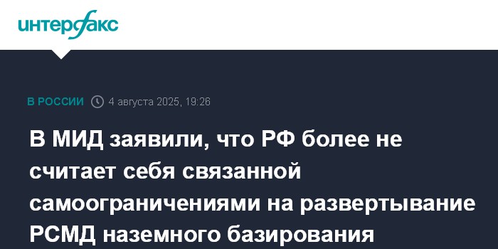 Москва. 4 августа. INTERFAX.RU - МИД РФ заявил, что Россия более не считает себя связанной самоограничениями на развертывание ракет средней и меньшей дальности (РСМД) наземного базирования.