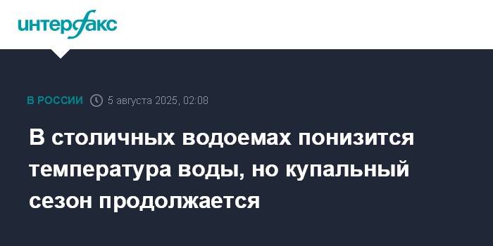 Москва. 5 августа. INTERFAX.RU - Температура воды в московских водоемах понизится к концу недели до 22 градусов, купальный сезон продолжится, но купание будет не таким комфортным из-за понижения дневной температуры, сообщил "Интерфаксу" научный руководитель Гидрометцентра России Роман Вильфанд.