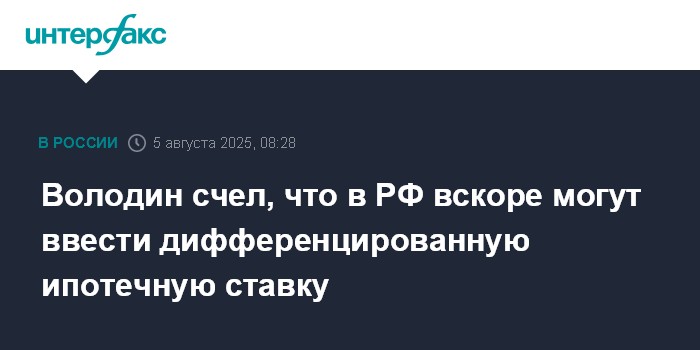 Москва. 5 августа. INTERFAX.RU - Председатель Госдумы Вячеслав Володин считает, что в ближайшее время может быть введена дифференцированная ипотечная ставка, отметил, что правительство обсуждает такую инициативу.