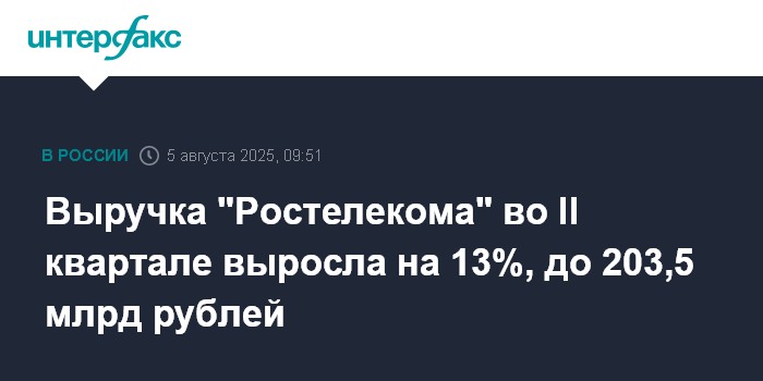 Москва. 5 августа. INTERFAX.RU - Выручка ПАО "Ростелеком" во II квартале по МСФО составила 203,5 млрд рублей, увеличившись на 13% по сравнению с аналогичным периодом 2024 года, говорится в сообщении компании.