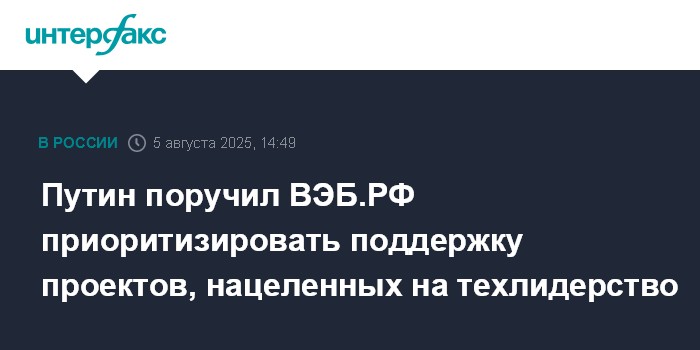 Москва. 5 августа. INTERFAX.RU - Президент РФ Владимир Путин поручил ВЭБ.РФ приоритизировать поддержку проектов, которые в первую очередь нацелены на технологическое лидерство, а не только на импортозамещение.