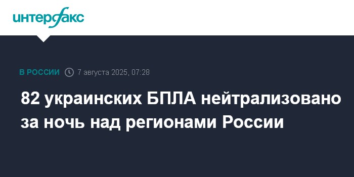 Москва. 7 августа. INTERFAX.RU - В течение прошедшей ночи с 23:30 среды до 06:10 четверга было ликвидировано 82 украинских дрона над регионами России, сообщили в Минобороны России.