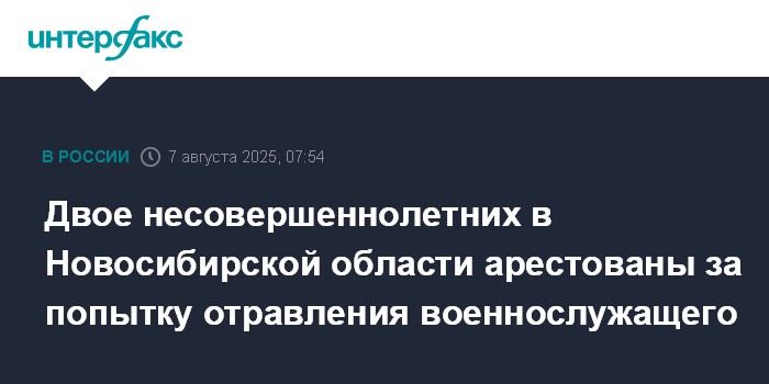 Москва. 7 августа. INTERFAX.RU - ФСБ и Следственный комитет РФ сообщили о задержании и аресте двух несовершеннолетних в Новосибирской области, которые по заданию украинских спецслужб планировали отравить российского военнослужащего.