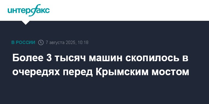 Москва. 7 августа. INTERFAX.RU - Число ожидающих проезда через досмотровые пункты на Крымском мосту машин в четверг утром достигло 3450, сообщает инфоцентр, освещающий ситуацию на автомобильных подходах к мосту.