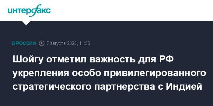 Москва. 7 августа. INTERFAX.RU - Всестороннее укрепление особо привилегированного стратегического партнерства с Индией имеет первостепенное значение для России, заявил секретарь Совета безопасности РФ Сергей Шойгу.